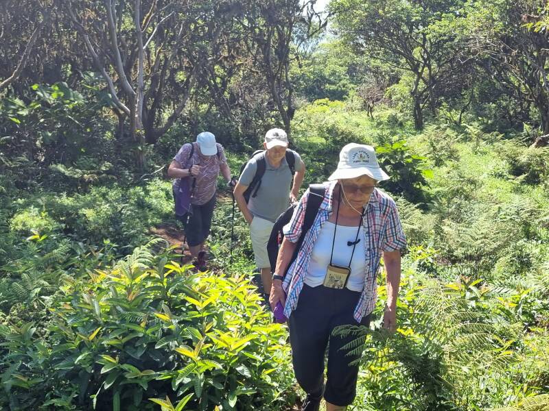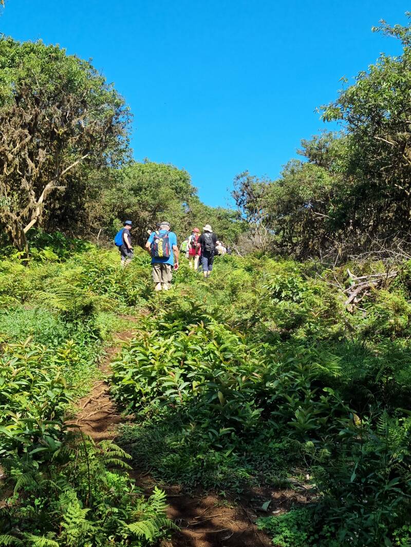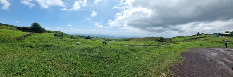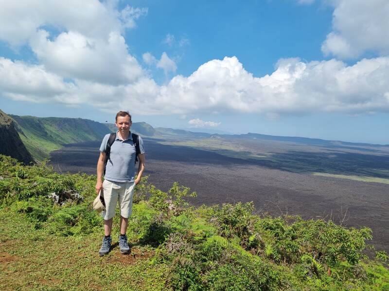Heute stehen zwei Aktivitäten auf dem Programm: vormittags eine Wanderung zum Krater Sierra Negra mit ungefähr 11 Kilometern Durchmesser. Nach dem Frühstück holt uns unser "Bus" ab und bringt uns ein Stück weiter ins Landesinnere, auf die Anhören des Vulkans. Das letzte Stück laufen wir, erst auf einem gut begehbaren Weg, die letzten paar Hundert Meter dann auf einem ziemlich steilen Pfad auf geradem Wege den Berg hoch. Belohnt werden wir mit einem fantastischen Panoramablick über den ganzen Krater.