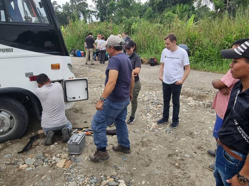 Als wir allerdings beim Bus ankommen, wartet eine unangenehme Überraschung auf uns: die Batterie ist leer. Der erste Versuch, ihn mit einem Pickup anzuschleppen, scheitert allerdings, trotz des heldenhaften und selbstlosen Einsatzes der Reisegruppe: die Frauen stehen als "Balast" auf der Ladefläche, die Männer schieben, die Kinder des Dorfs bilden das interessierte Publikum. Leider reißt das Seil, glücklicherweise ohne Verletzungen. Erst der Tausch der Batterie bringt den gewünschten Erfolg und wir starten mit etwas Verspätung nach Baños.