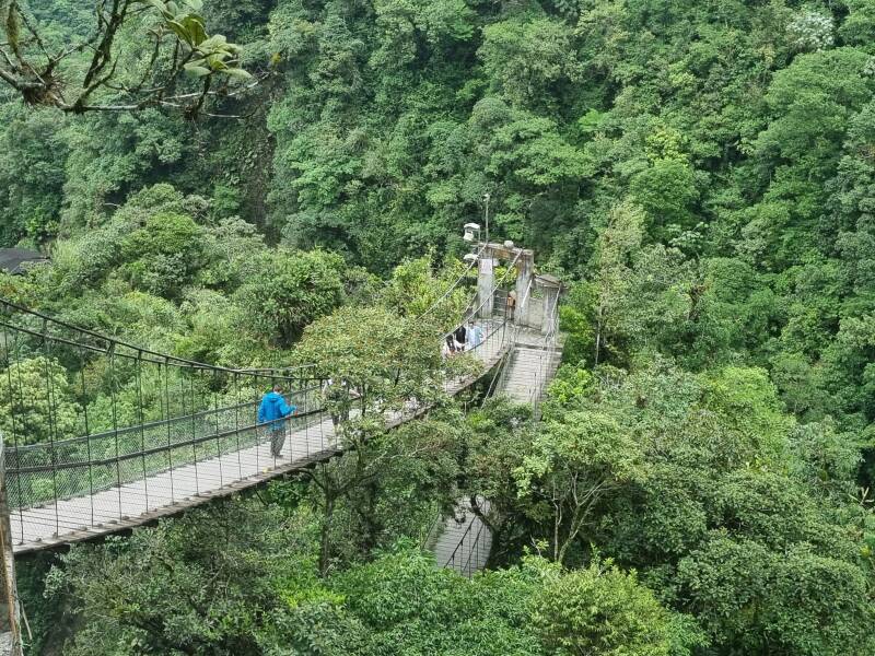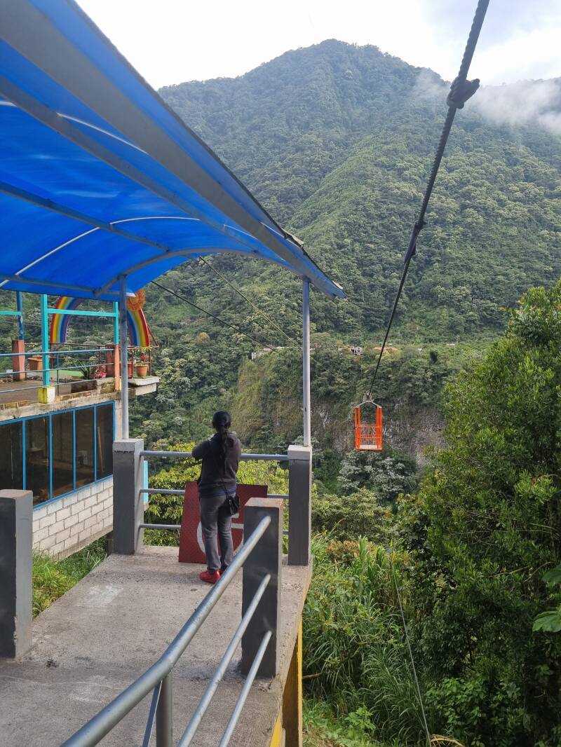 Kurz vor Baños machen wir noch einmal einen Halt an der "Cascada Manto de la Novia", einem Wasserfall auf der gegenüberliegenden Seite einer breiten Schlucht. Diese kann man auf zwei Arten überqueren, mit einer eher antik aussehenden Gondel oder per Canopy, also eingehängt an einem Stahlseil. Ein Teil der Gruppe wagt das Erlebnis, Johannes und Brigitte bevorzugen die Gondel.