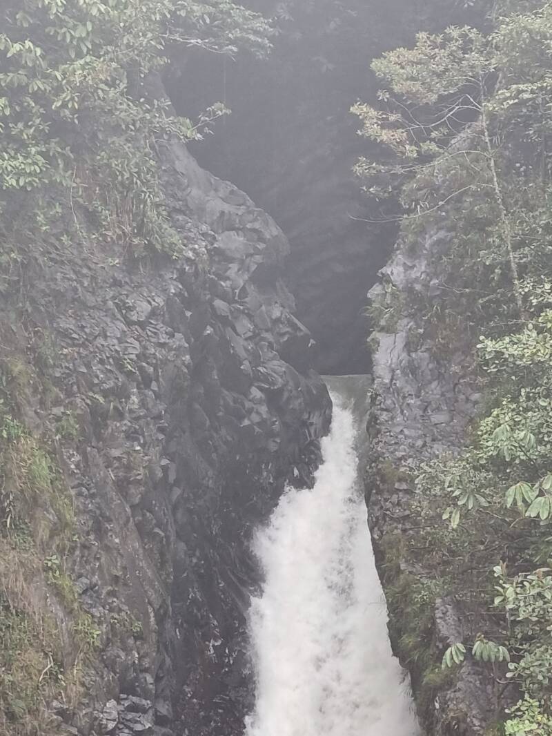 Es geht wieder zurück über den Schotterweg in Richtung Tena, diesmal Richtung Süden. Am Wasserfall "Cascada El Pailón", dem Wasserfall mit dem Teufelsgesicht legen wir einen Zwischenstopp ein. Lukas und Johannes machen sich auf den Weg nach unten, Johanna und Brigitte bevorzugen eine Pause mit frischer Kokosnuss.