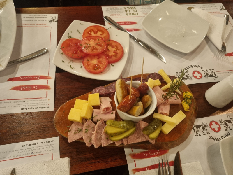 Wir kommen erst bei Dunkelheit im Hotel an. Da wir keine Lust haben, noch nach einer Alternative fürs Abendessen zu suchen, gehen wir ins Hotelrestaurant, einem Schweizer Bistro 😂. Die Speisekarte erfüllt sämtliche Klischees, von Älplermagronen über Rösti bis zu Fondue. Wir lachen darüber, aber es schmeckt.