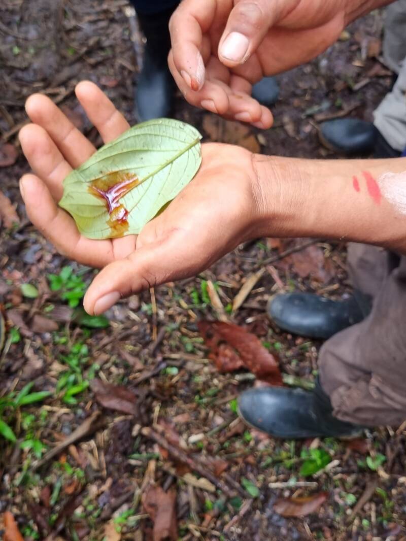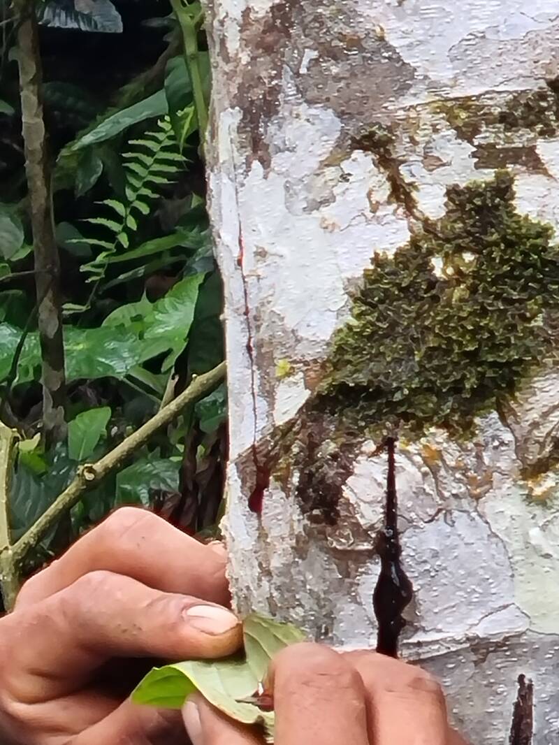 Heute ist sicher einer der Höhepunkte der Reise, die Wanderung durch den Regenwald. Ausgerüstet mit Gummistiefeln, Stock und der eindringlichen Ermahnung, auf gar keinen Fall irgendetwas anzufassen, starten wir um 9:00 Uhr bei einigermaßen trockenem Wetter. Wir lernen viel über die vollständige Verwendung einer Palme für Kleidung, Hausbau und den Bedarf des täglichen Lebens, die medizinische Wirkung des Drachenblutbaums, essbare und ungenießbare Ameisen, werden mit Symbolen der Kichwa in Naturfarbe bemalt, nebenbei wird Johanna zur Dschungelkönigin erkoren, kurzum, ein toller, interessanter und lustiger Vormittag.