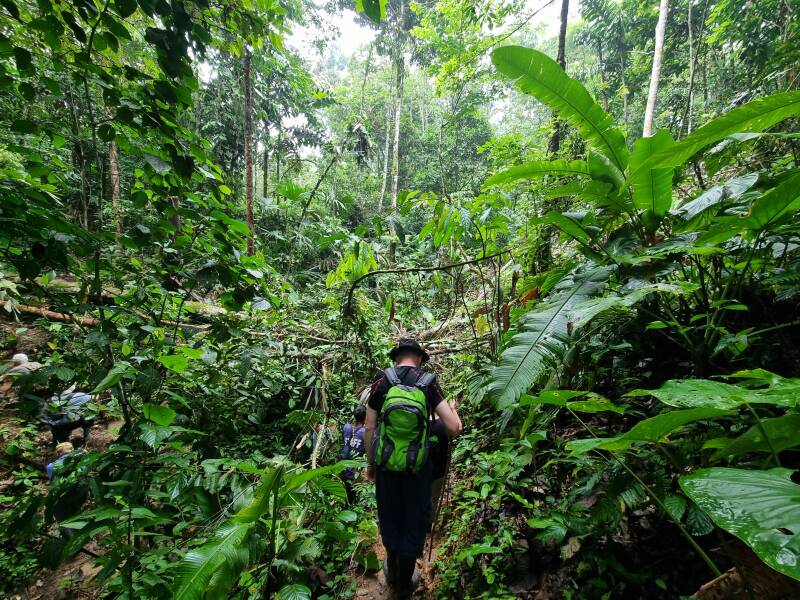 Den Abschluss des Tages bildet nochmals ein kleiner Spaziergang, zum "Stinkevogel". Der sitzt zwar ziemlich weit weg auf den Bäumen, dafür sehen wir aber eine eindrucksvolle Kakao-Plantage.