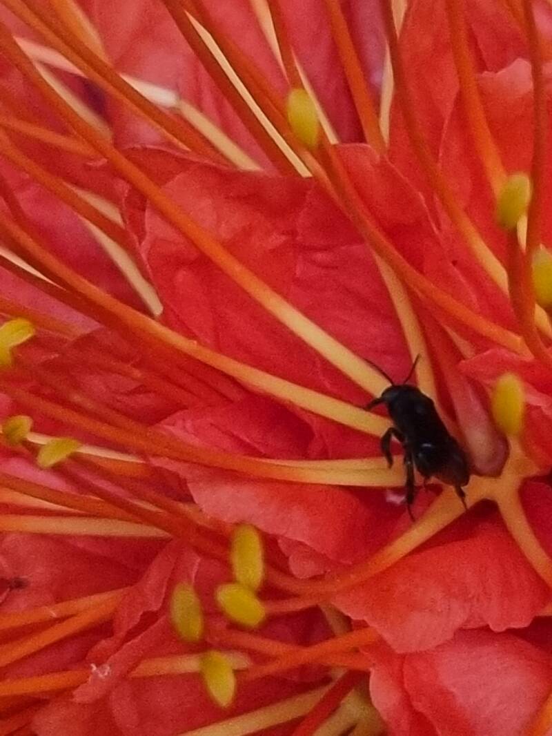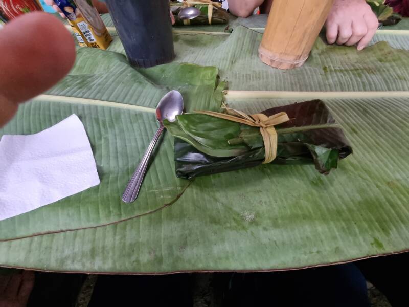 Wegen des Regens wird das eigentlich vorgesehene Picknick in einen bewirtschafteten Unterstand verlegt, mit aus wundervollen Pflanzen der Umgebung schön dekorierten Tischen. In den prächtigen Blüten sammeln sogar Wildbienen ihren Honig.