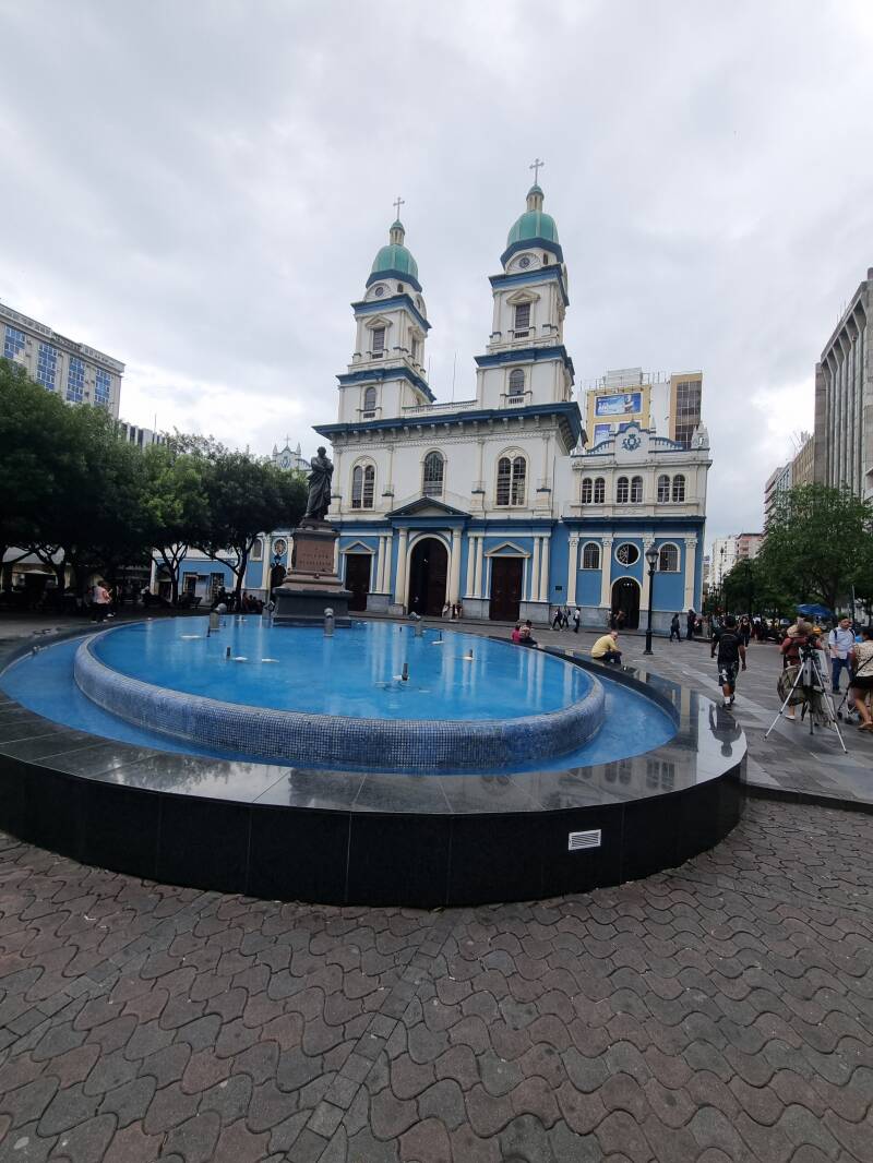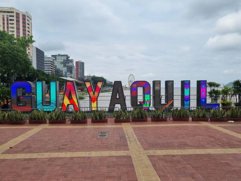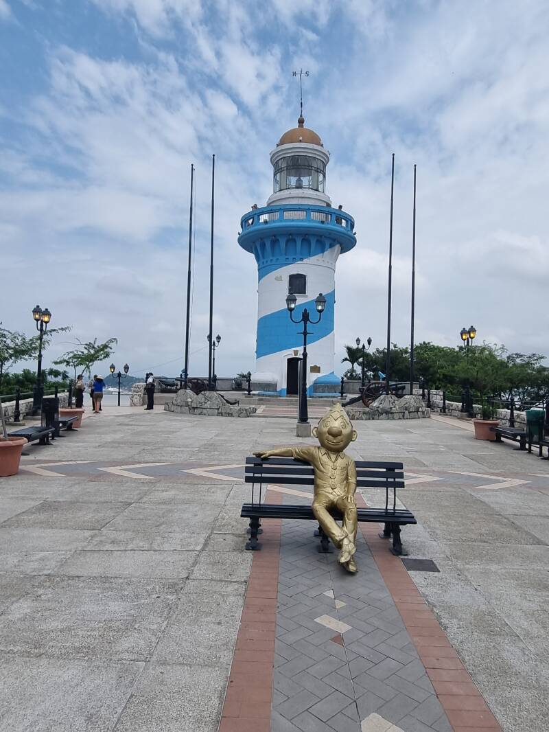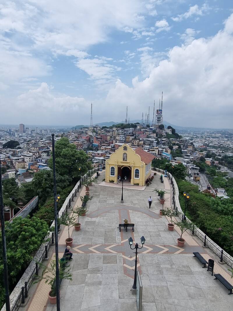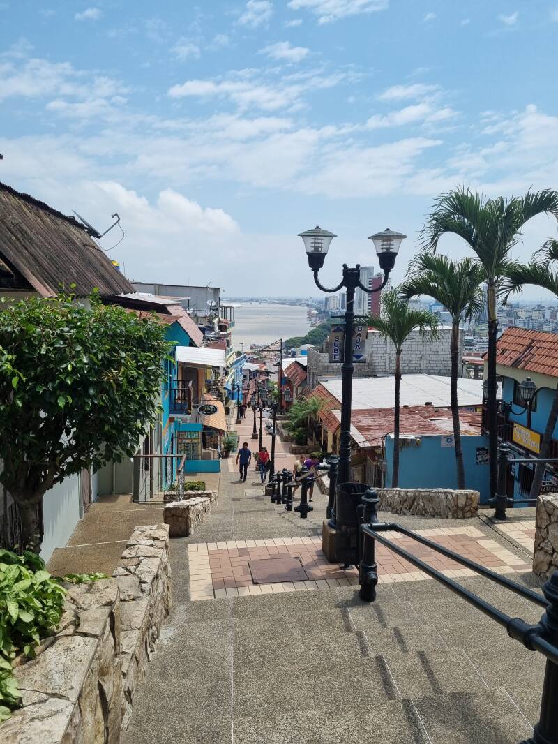 In Guayaquil angekommen, stoppen wir am Fuße eines Aussichtspunkts, der über 444 Stufen zu erklimmen ist. Lukas, Brigitte und Johanna rasten mit einigen der Reisegruppe auf einem Drittel des Weges, Johannes stapft in der Hitze mehr oder wenig munter mit dem Rest der Gruppe unter Polizeischutz weiter. Aufgrund der hohen Kriminalität sind überall Polizei und Sicherheitsdienste präsent.