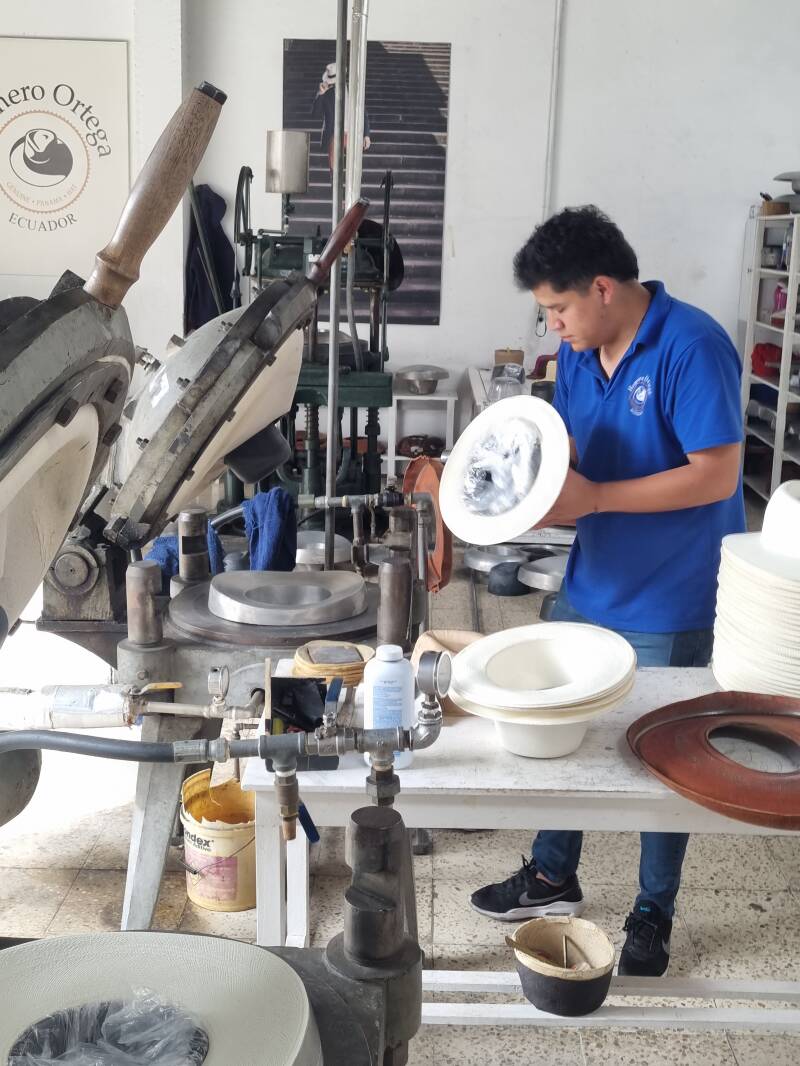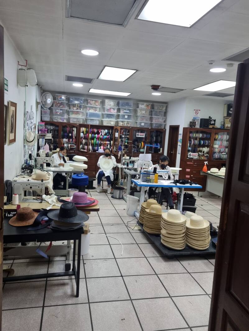 Nach einer Viertelstunde geht es weiter zu einer Manufaktur für Panama-Hüte, in der wir viel über die Herstellung lernen. Die Palmenfasern werden im Dschungel geerntet, dort schon gespalten und gekocht. Frauen im Dschungel flechten die Rohlinge, die hier angeliefert werden. In der Manufaktur werden sie dann zugeschnitten, gefärbt und in Form gebracht.