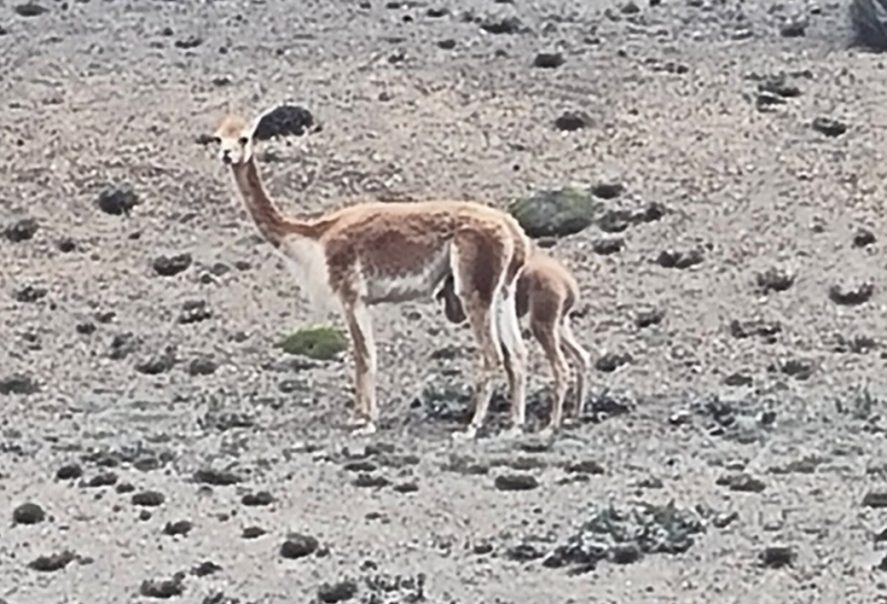Unterwegs zum Chimborazo sehen wir mehrere Vicuñas, die wie Lamas und Alpacas zu den Andenkamelen gehören. Neugierig beugen sie uns beim Fotografieren.